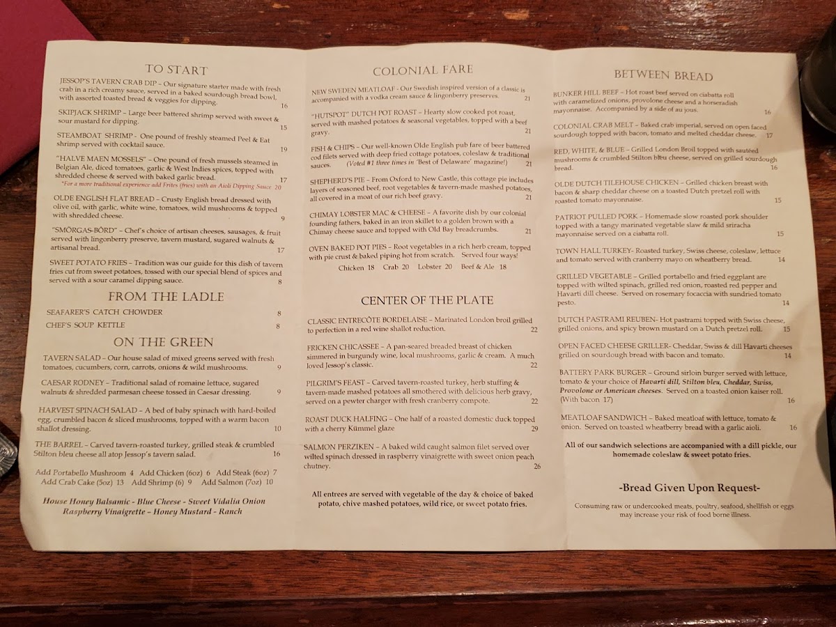 Welcome to Jessop's Tavern & Colonial Restaurant, a unique culinary destination located in the heart of historic New Castle, DE. With its charming colonial atmosphere, dining here is like stepping back in time. The menu beautifully captures traditional fare, featuring standout dishes like the New Sweden Meatloaf, rich with a vodka cream sauce and lingonberry preserves, and the heartwarming Hutspot Dutch Pot Roast, served with mashed potatoes and gravy.